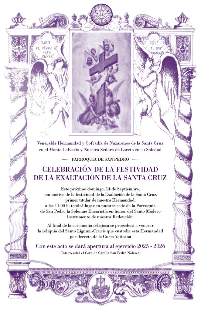 a las 11,00 h. tendrá lugar en nuestra sede de la Parroquia de San Pedro la Solemne Eucaristía en honor del Santo Madero instrumento de nuestra Redención.
